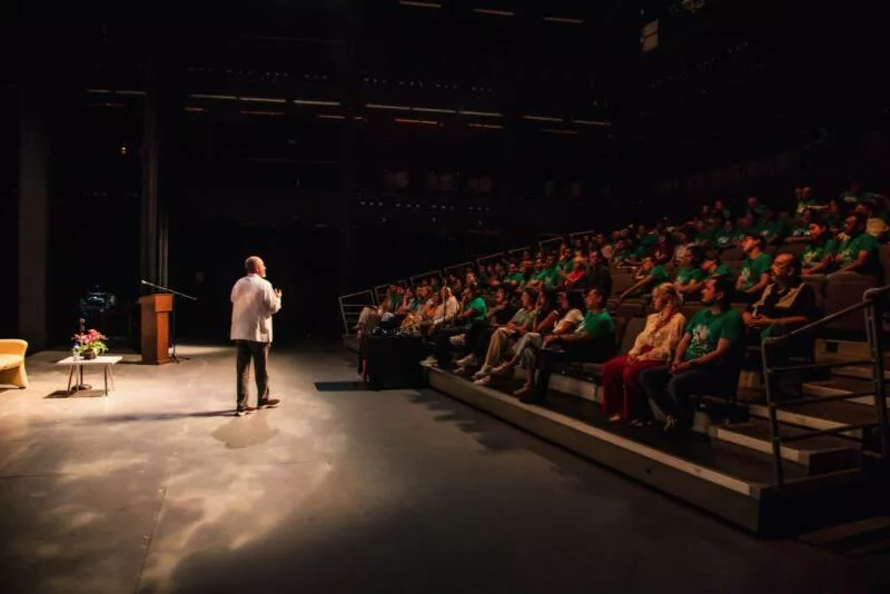 «Ustedes, a través del teatro, son portadores e inventores de historias, relatos y narraciones. Son privilegiados en la posibilidad de fomentar la palabra y les deseo mucho éxito, no solo el teatro, también en esa capacidad de gestionar la cultura, que se trata de gestionar lo humano», apuntó durante su charla.