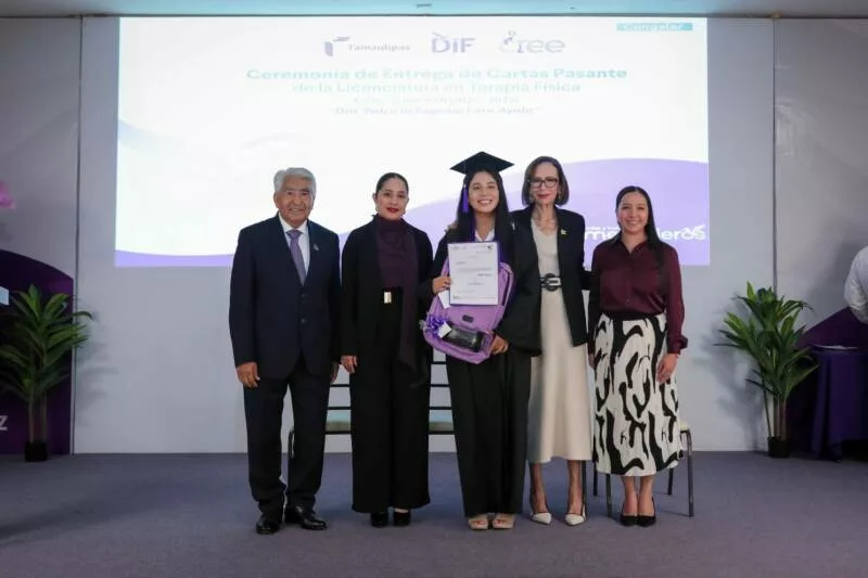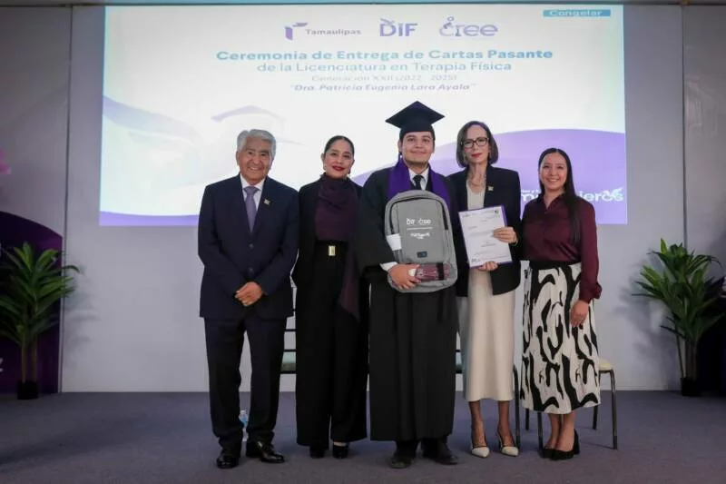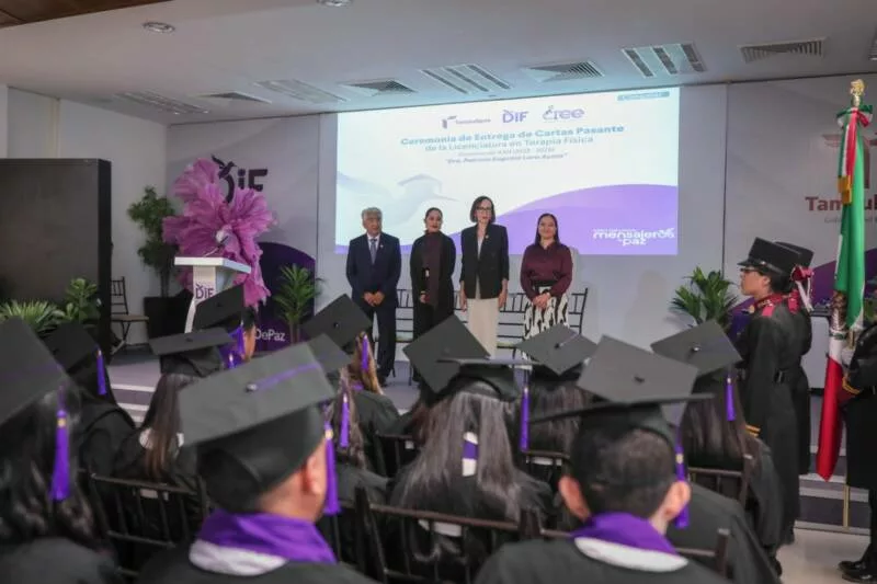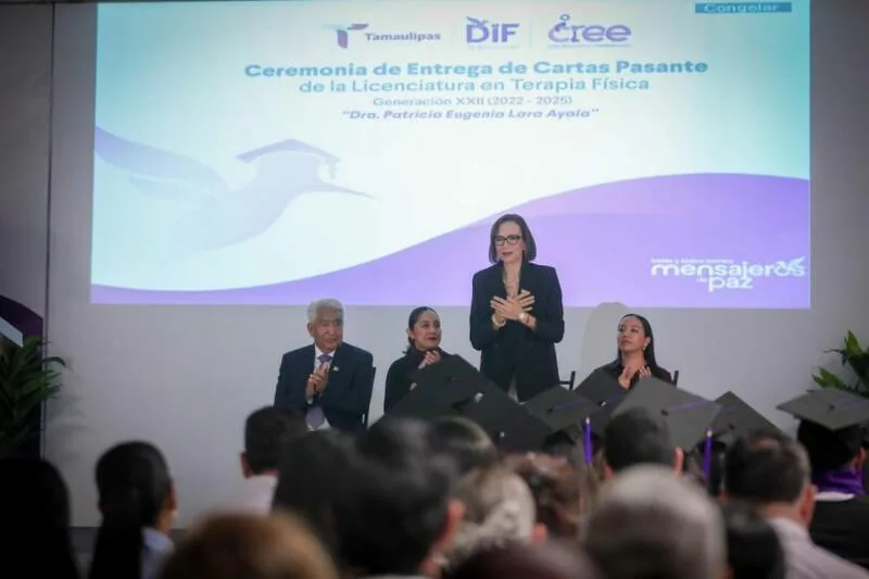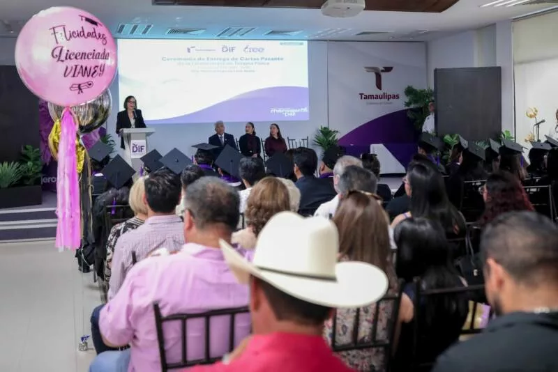 Ciudad Victoria, Tamaulipas. El Sistema para el Desarrollo Integral de la Familia de Tamaulipas, que preside la doctora María de Villarreal, llevó a cabo en el auditorio principal de esta institución la ceremonia de entrega de cartas de pasante a 24 nuevos profesionistas egresados de la Licenciatura en Terapia Física del Centro de Rehabilitación y Educación Especial (CREE), dependiente de este sistema.
