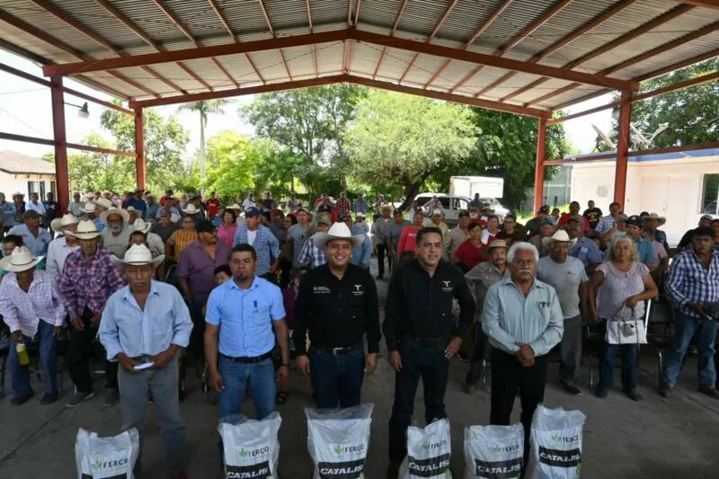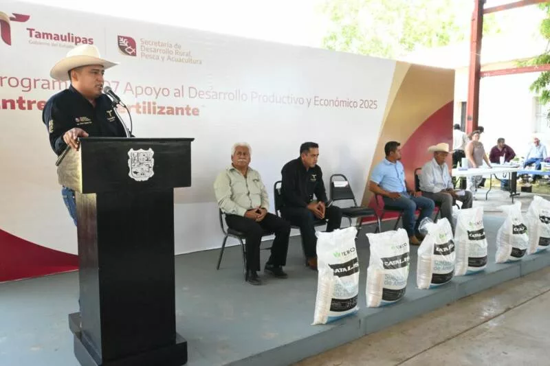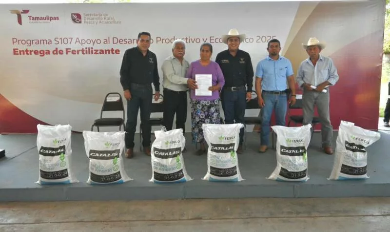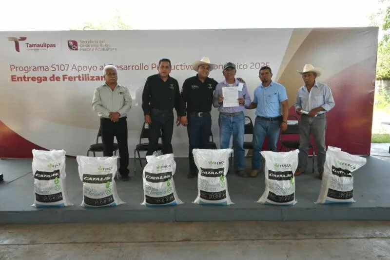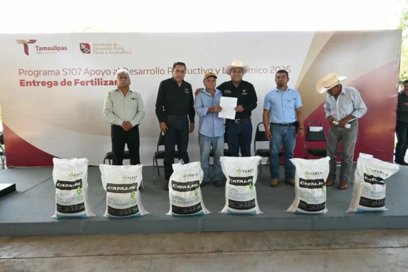 Llera, Tamaulipas. – Reafirmando el compromiso del Gobierno del Estado con el fortalecimiento del sector citrícola, la Secretaría de Desarrollo Rural, Pesca y Acuacultura llevó a cabo la entrega de más de 93 toneladas de fertilizante sulfato de amonio en beneficio de 335 productores del municipio de Llera.