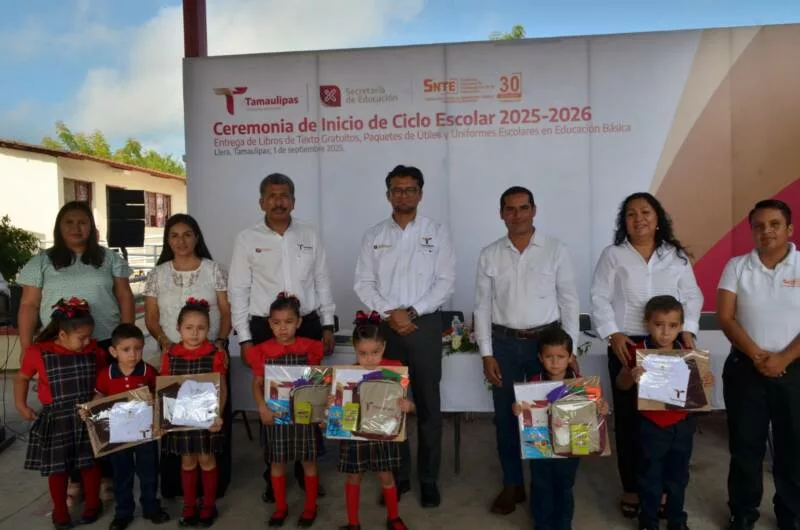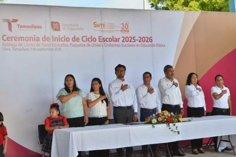 Llera, Tamaulipas.- En representación del gobernador Américo Villarreal Anaya, el secretario de Desarrollo Energético de Tamaulipas, Walter Julián Ángel Jiménez, y el subsecretario de Inversión, Proyectos Estratégicos y Desarrollo Sostenible, Óscar Xitec Pérez Contreras, inauguraron el ciclo escolar 2025-2026 en Llera y Díaz Ordaz, respectivamente.