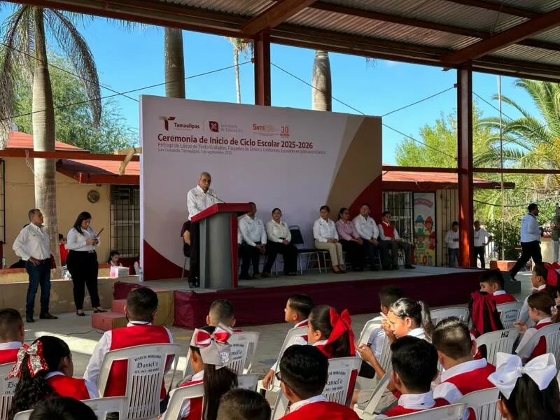 San Fernando, Tamaulipas.- En representación del gobernador Américo Villarreal Anaya, el Secretario de Desarrollo Rural, Pesca y Acuacultura, Antonio Varela Flores, puso en marcha las actividades del ciclo escolar 2025-2026 en la escuela Primaria Antonio Beltrán Gracia, ubicada en el municipio de San Fernando.