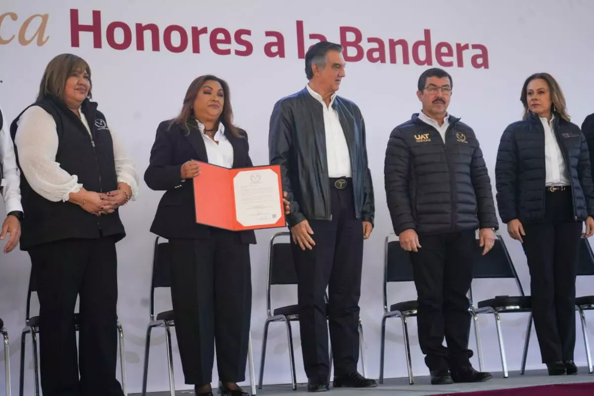 El gobernador Américo Villarreal Anaya, junto con el rector de la Universidad Autónoma de Tamaulipas (UAT), Dámaso Anaya Alvarado, encabezó este lunes la ceremonia de honores a la bandera y atestiguó la toma de protesta de la Dra. María Guadalupe Vázquez Salazar como directora de la Facultad de Enfermería Victoria para el periodo 2026-2029.