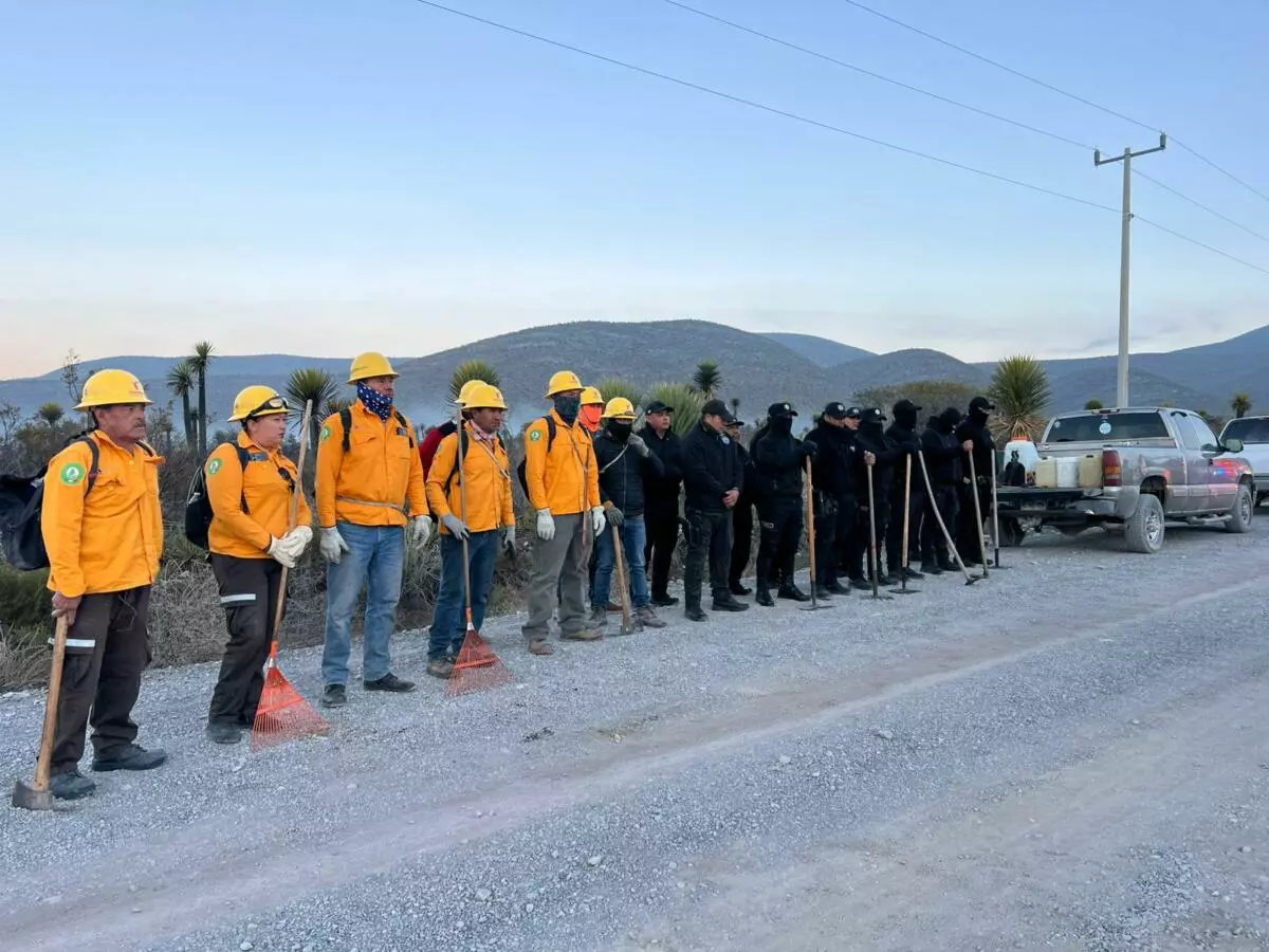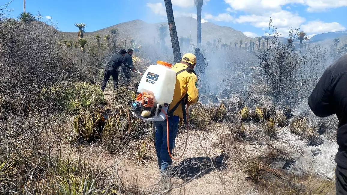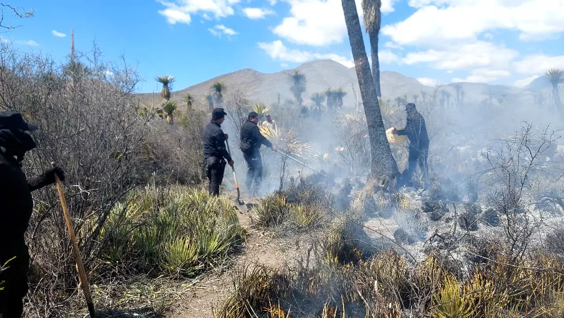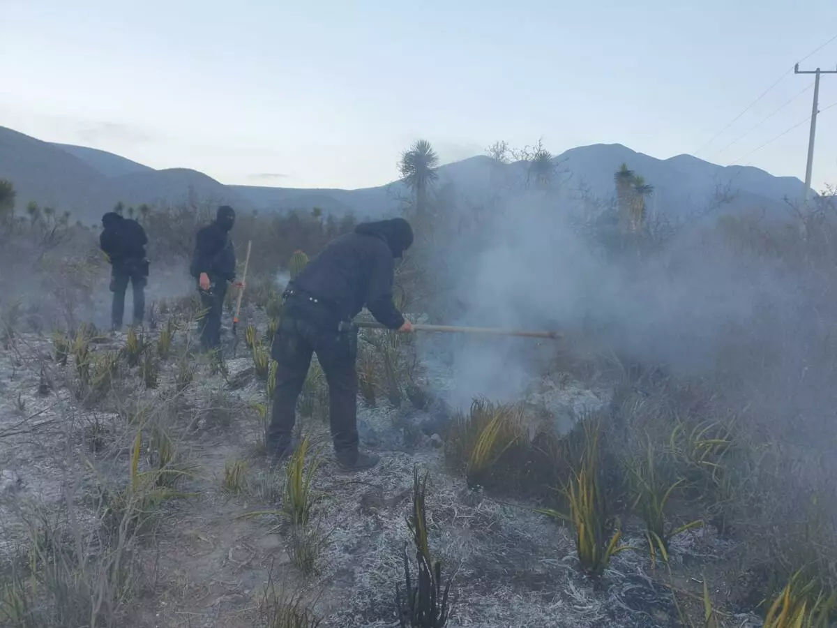 Doce elementos de la Guardia Estatal trabajan en conjunto con personal de Protección Civil municipal y brigadistas de la Comisión Nacional Forestal (Conafor) para contener el avance del fuego.
