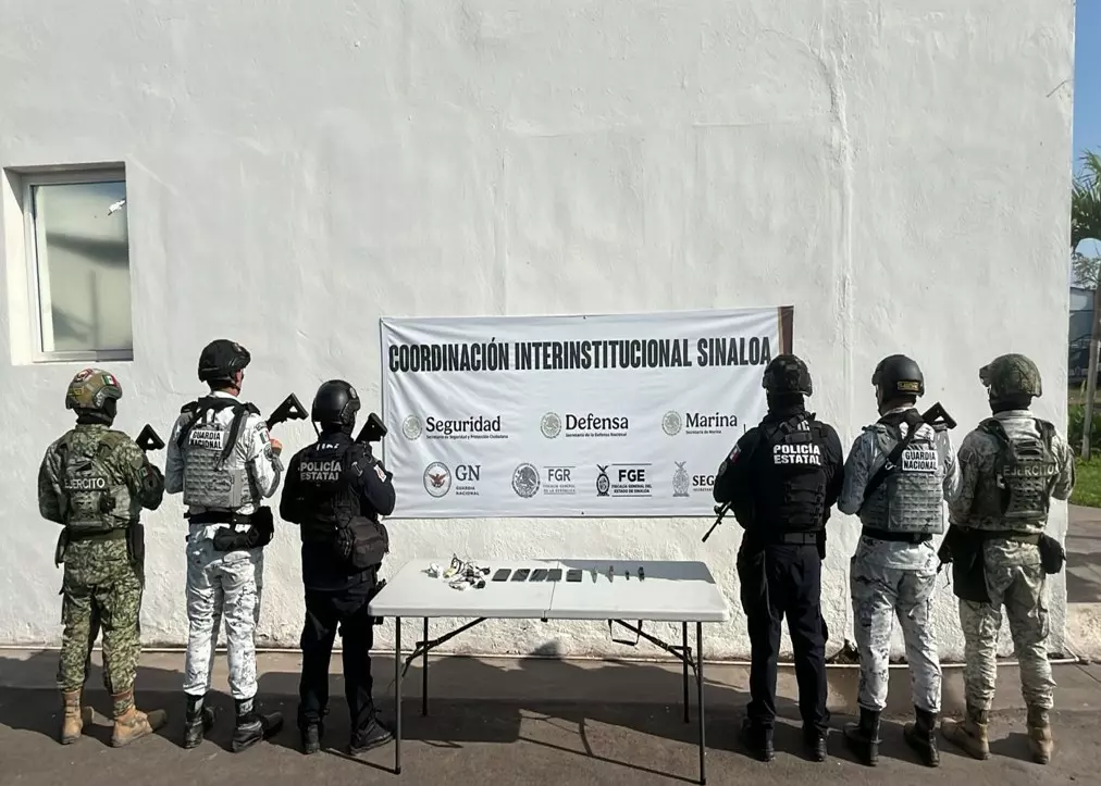 -En Mazatlán, en el poblado Los Copales, elementos de SSPC y Semar localizaron bultos entre la vegetación, aseguraron ocho artefactos explosivos improvisados, tres cargadores, 32 cartuchos, cuatro chalecos tácticos y 6.5 kilos de marihuana.