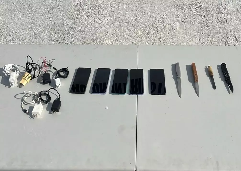 -En Culiacán, en el centro Penitenciario Aguaruto, elementos del Ejército Mexicano, GN y Policía Estatal aseguraron cinco celulares, seis cargadores para celular y cuatro puntas.