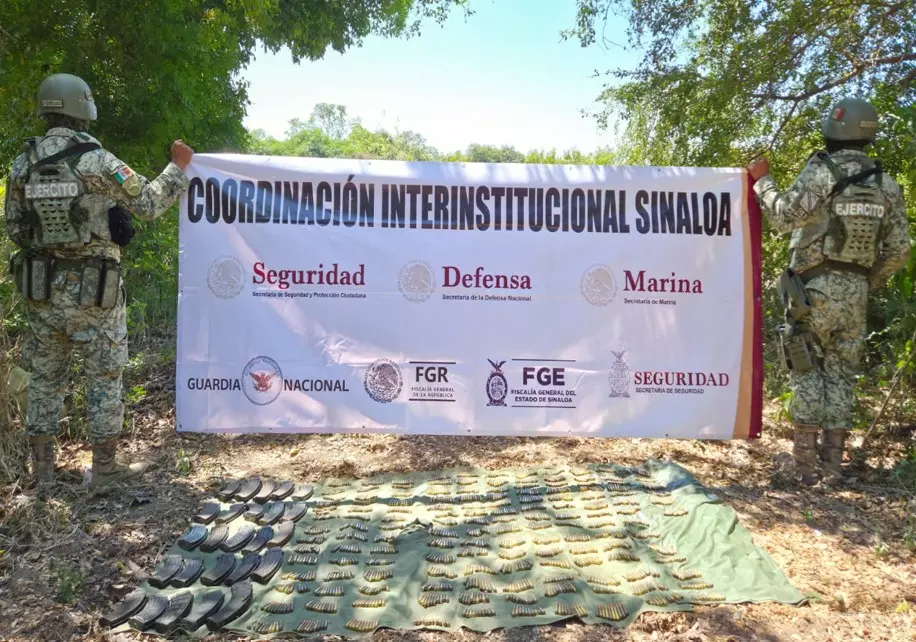 • En Sinaloa, elementos de SSPC y Semar localizaron bultos entre la vegetación, aseguraron ocho artefactos explosivos improvisados, tres cargadores, 32 cartuchos, cuatro chalecos tácticos y 6.5 kilos de marihuana