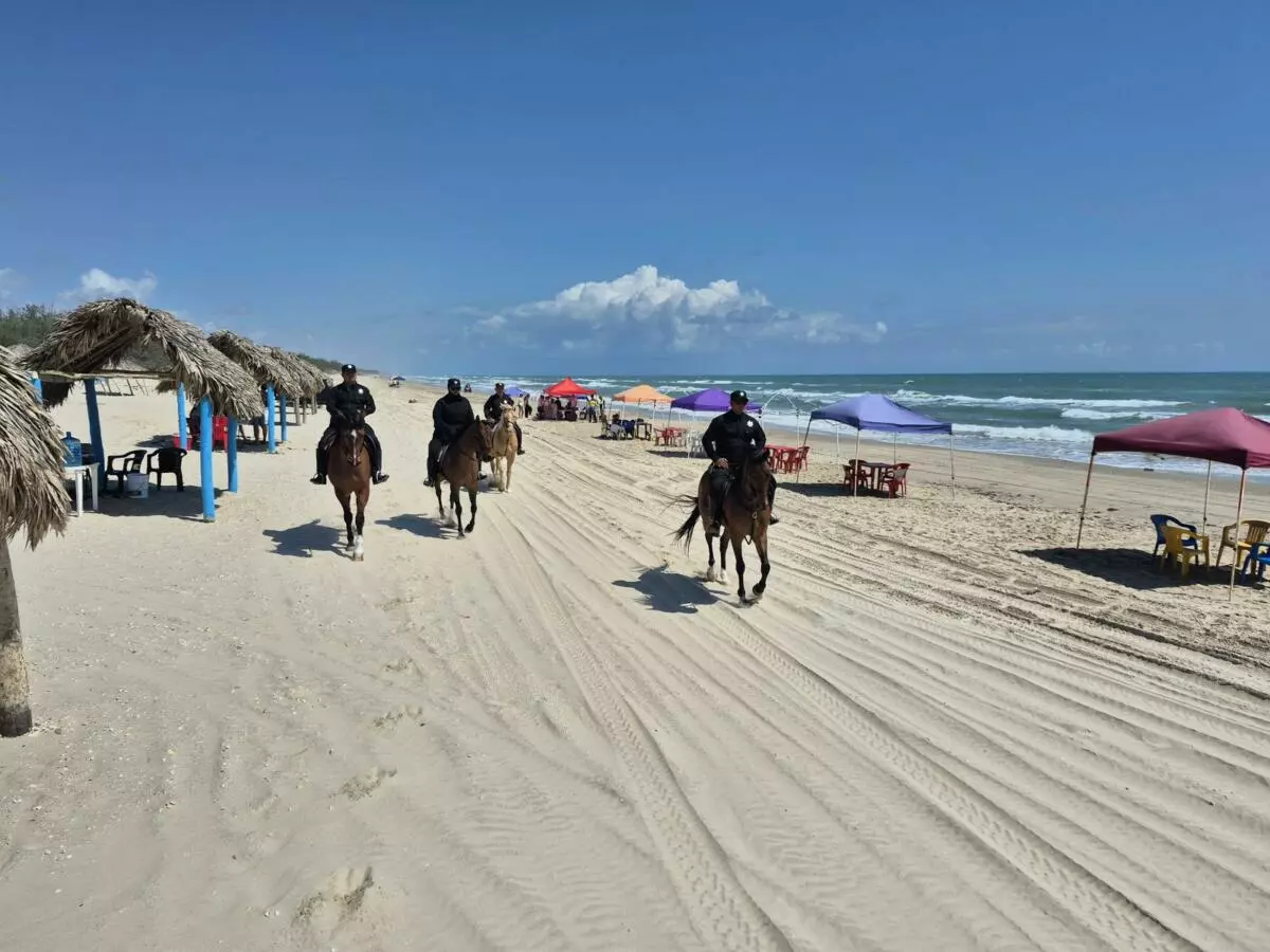 Soto la Marina, Tamaulipas.– En el marco del operativo Semana Santa 2026, caballos y jinetes del Agrupamiento Montado de la Guardia Estatal realizan labores de vigilancia y proximidad en la Playa La Pesca, ubicada en el municipio de Soto la Marina.