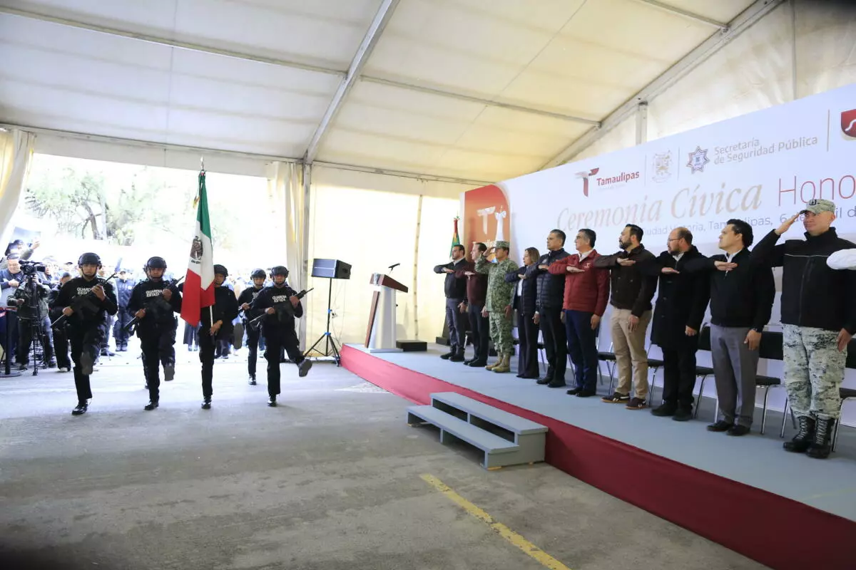 Acompañaron al gobernador en esta ceremonia: Tania Contreras López, presidenta del Supremo Tribunal de Justicia; Humberto Armando Prieto Herrera, presidente de la Junta de Gobierno del Congreso del Estado; Sergio Ojeda, presidente de la Mesa Directiva del Congreso; Héctor Villegas González, secretario general de Gobierno; Willy Zúñiga Castillo, secretario ejecutivo del Sistema Estatal de Seguridad Pública; Eduardo Govea Orozco, fiscal general de Justicia; Adolfo Amparán Hernández, coordinador estatal de la Guardia Nacional en Tamaulipas, y Gerardo Martínez Andrade, en representación de la 48 Zona Militar.