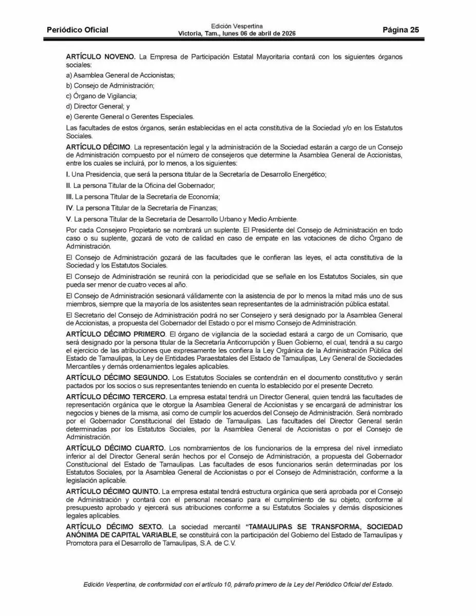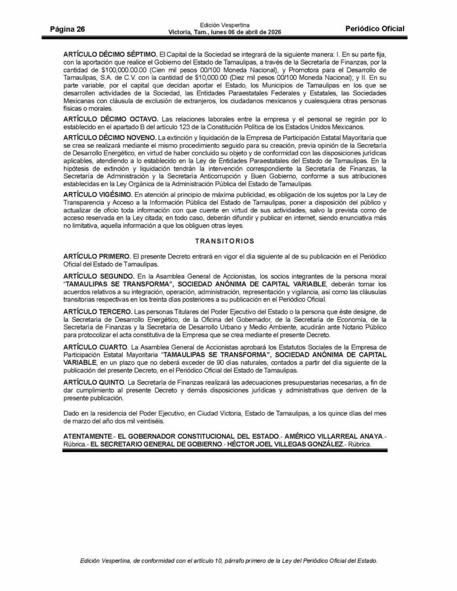 Ciudad Victoria, Tamaulipas.- El lunes 06 de abril fue publicado en la versión vespertina del Periódico Oficial del Gobierno del Estado de Tamaulipas, el decreto gubernamental para la creación de la empresa de participación estatal mayoritaria denominada “Tamaulipas se transforma, S.A. de C.V.”, que trabajará como un brazo aliado de la Secretaría de Desarrollo Energético del estado.